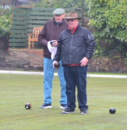 The Club's new President, Bill Mitchell, weighs up the somewhat wet conditions as he looks on as he and Chairman, Brian Ridley, formally open the the green for 2017 Season in the Club's traditional Good Friday social event! It wasn't too long before the pie and peas got the better of them as they took sheletr in the dry and warm surroundings of the club house!!